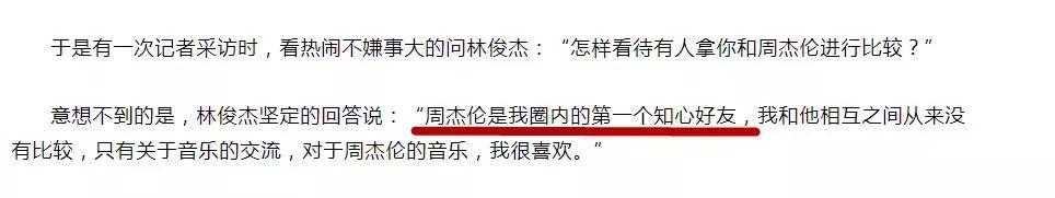 虽然粉丝们争的是热火朝天,但是周杰伦和林俊杰两位正主不仅没有王不见王的争锋相对,反而私下还是很好的朋友,成了乐坛的传奇故事。林俊杰刚出道不久接受采访时就曾说“周杰伦是我圈内第一个知心好友。”