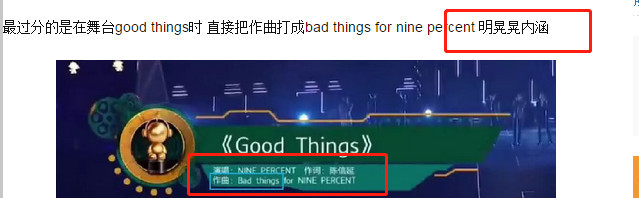在舞台表演时,字幕作曲一栏上写的是“bad things for nine percent”。粉丝表示这不仅仅是专业性不足,更是明晃晃的内涵。