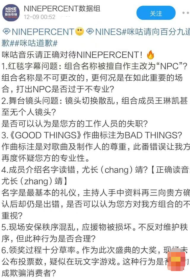 12月9日凌晨,nine percent数据组在社交平台发文,细数咪咕盛典六宗罪,并要求其向nine percent男团道歉。