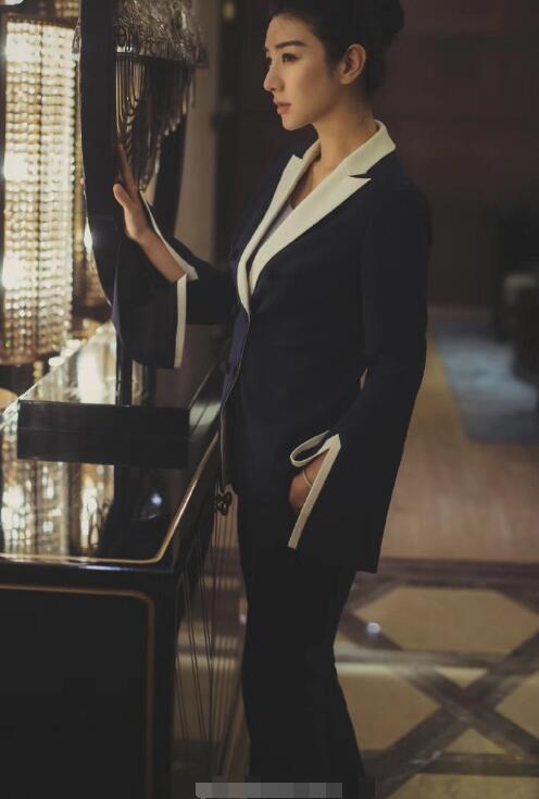照片中,黄奕身穿深蓝色西服套装简约时尚,将帅气与性感集为一身,魅力十足。精致的妆容搭配利落的丸子头,眼神笃定,多了一丝清冷的气质。