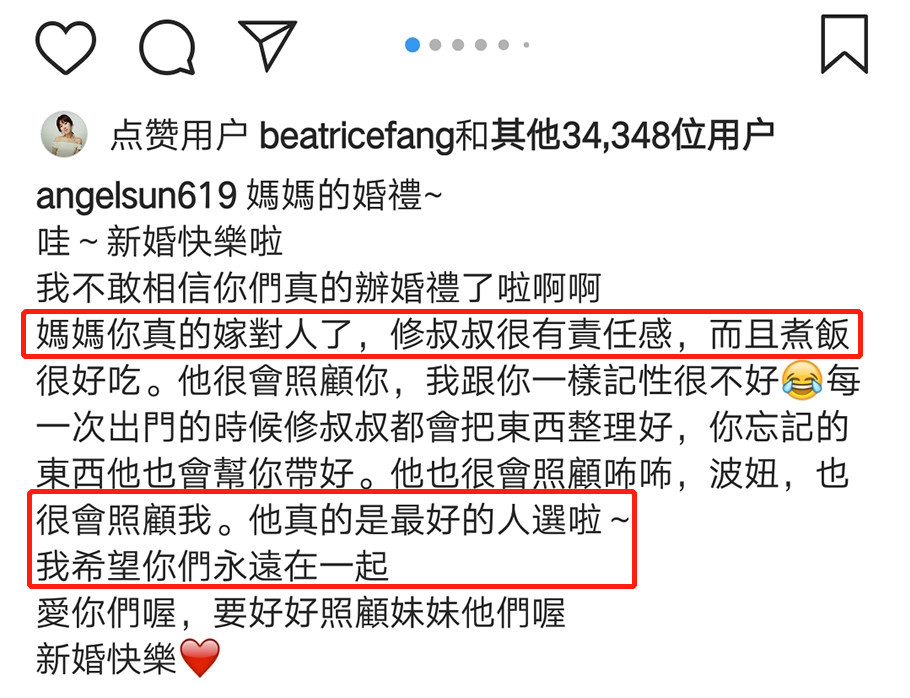 原标题:梧桐妹晒贾静雯结婚照 称修叔叔是最好的人选