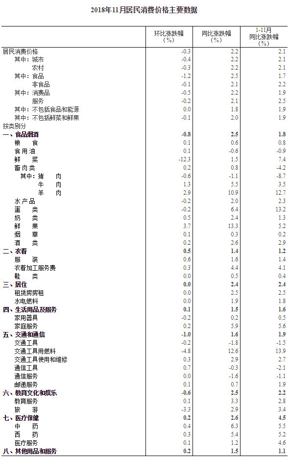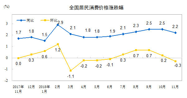 2018年11月份居民消费价格同比上涨2.2%