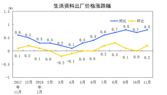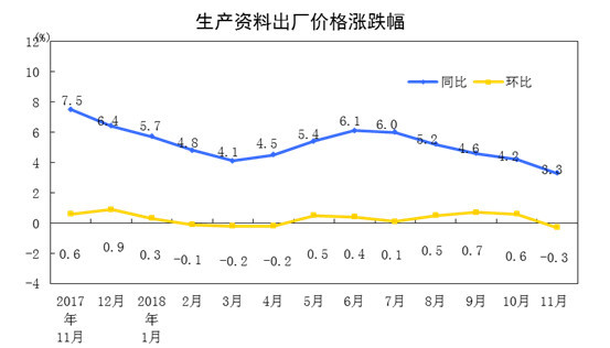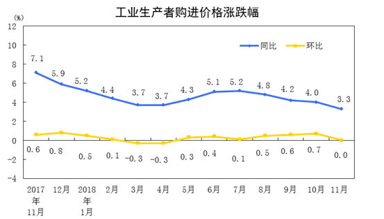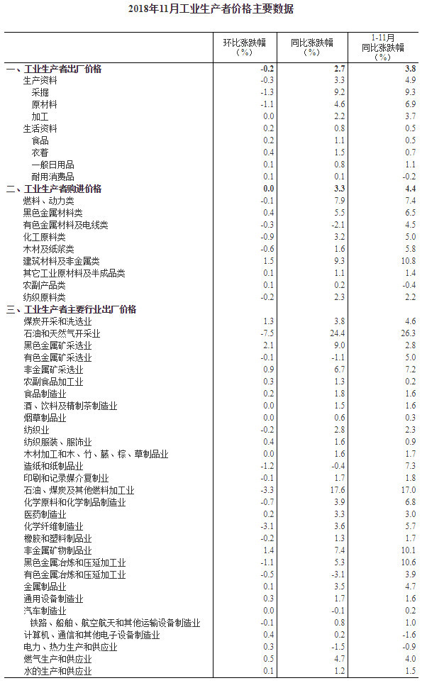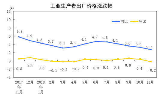 2018年11月份,全国工业生产者出厂价格同比上涨2.7%,环比下降0.2%。工业生产者购进价格同比上涨3.3%,环比持平。1-11月平均,工业生产者出厂价格比去年同期上涨3.8%,工业生产者购进价格上涨4.4%。