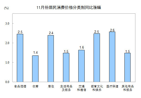 从同比看,CPI上涨2.2%,涨幅比上月回落0.3个百分点。其中,食品价格上涨2.5%,影响CPI上涨约0.49个百分点;非食品价格上涨2.1%,影响CPI上涨约1.68个百分点。在食品中,鲜果、鸡蛋和鲜菜价格分别上涨13.3%、5.2%和1.5%,三项合计影响CPI上涨约0.27个百分点;牛肉和羊肉价格分别上涨5.5%和10.9%,禽肉和水产品价格分别上涨4.5%和2.0%,上述四项合计影响CPI上涨约0.15个百分点;猪肉价格下降1.1%,降幅连续第6个月收窄。在非食品中,居住价格上涨2.4%,影响CPI上涨约0.52个百分点;教育文化和娱乐、医疗保健价格分别上涨2.5%和2.6%,合计影响CPI上涨约0.50个百分点; 汽油和柴油价格分别上涨12.8%和14.2%,合计影响CPI上涨约0.25个百分点。据测算,在11月份2.2%的同比涨幅中,去年价格变动的翘尾影响约为0.3个百分点,新涨价影响约为1.9个百分点。