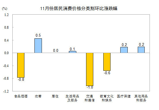 11月份,全国居民消费价格环比下降0.3%。其中,城市下降0.4%,农村下降0.3%;食品价格下降1.2%,非食品价格下降0.1%;消费品价格下降0.5%,服务价格下降0.2%。