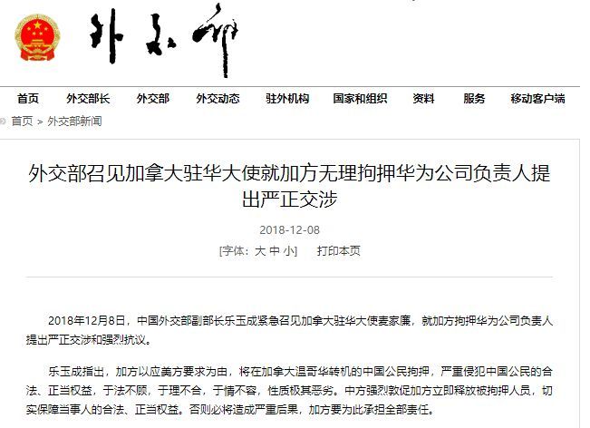 2018年12月8日,中国外交部副部长乐玉成紧急召见加拿大驻华大使麦家廉,就加方拘押华为公司负责人提出严正交涉和强烈抗议。