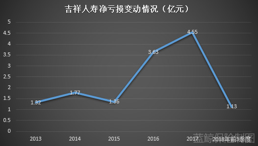 从盈利能力来看,成立6年以来,吉祥人寿始终未能实现盈利,至今共计亏损约14.5亿元。自2012年9月份开业后,吉祥人寿当年净亏损0.72亿元;2013年-2017年分别净亏损1.32亿元、1.77亿元、1.36亿元 、3.63亿元 、4.55亿元。根据其最新披露的偿付能力报告显示,吉祥人寿2018年1-3季度净亏损分别为0.28亿元、0.44亿元、0.41亿元,前三季度累计亏损达1.13亿元。