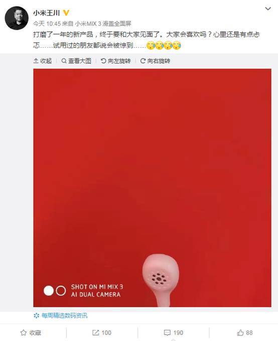在今天小米王川突然在自家的微博上发布了一条小米新品的消息,称“打磨了一年的新产品,终于要和大家见面了。大家会喜欢吗?心里还是有点忐忑……试用过的朋友都说会被惊到”,并且配上了一张红色底色的图片!