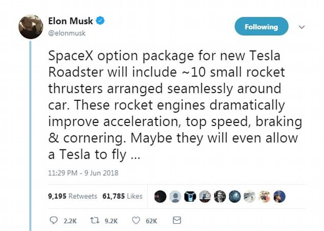 原标题:特斯拉跑车将加装火箭助推器 加速比跳楼还快得多