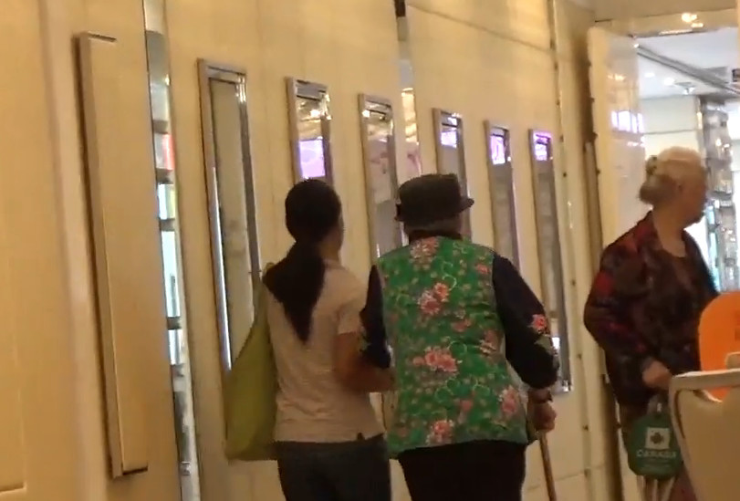 等进了商场后梅妈才一只手拄着拐杖走路,另一只手继续抓着工人姐姐的手。