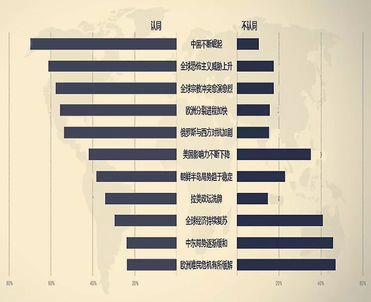 问及“下列有关当前局势变化的描述,您是否认同”时,调查显示:认同度最高的是69.8%的中外受访者认同“中国不断崛起”;然后依次为“全球恐怖主义威胁上升”“全球宗教冲突愈演愈烈”“欧洲分裂进程加快”“俄罗斯与西方对抗加剧”“美国影响力不断下降”。对此选项,接受环环采访的中外学者因视角不同,给出不同的先后顺序。德国学者霍尔泽格尔把美国影响力下降排首位,然后依次是中国不断崛起、欧洲分裂进程加快、俄罗斯与西方对抗加剧、全球恐怖主义威胁上升、朝鲜半岛局势趋于稳定等。而国内学者刘仰首选的还是中国不断崛起。