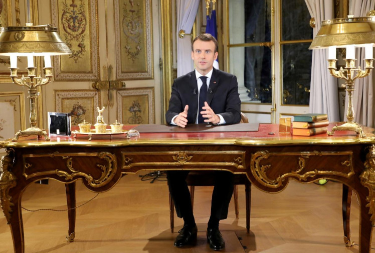 马克龙在爱丽舍宫发表电视讲话。