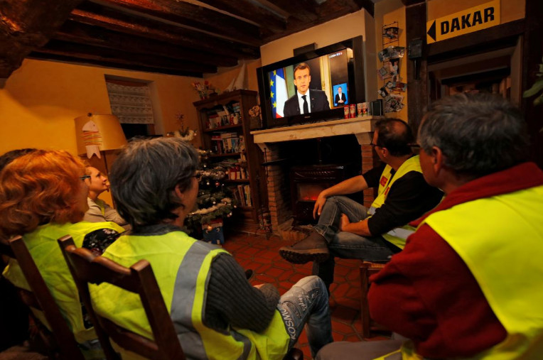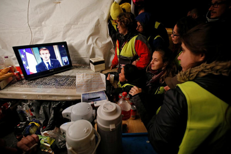 “黄背心”示威者观看马克龙电视讲话。