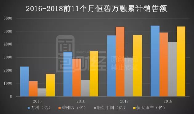 2018年前11个月,恒大、碧桂园、万科和融创的累计销售总额创出历史新高。以下为2016年至今前11个月恒碧万融的累计销售额变动图:
