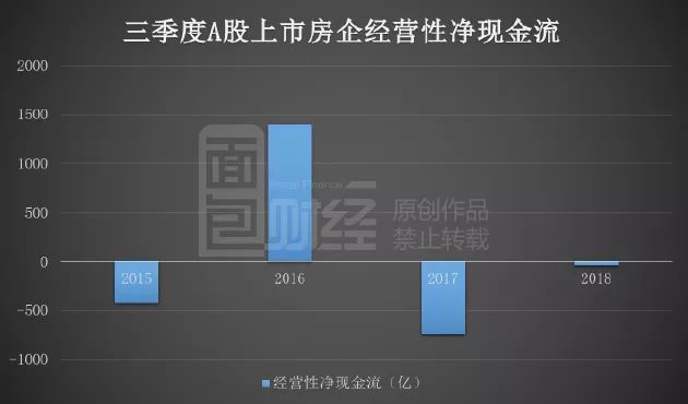 从上图来看,截至三季末A股上市房企的经营性现金流合计流出33.23亿元,虽然较2017年同期相比净流出大幅减少,但仍然处于净流出状态。
