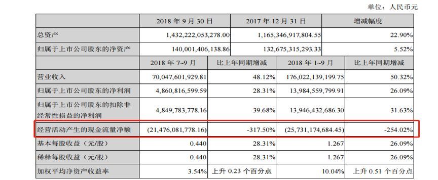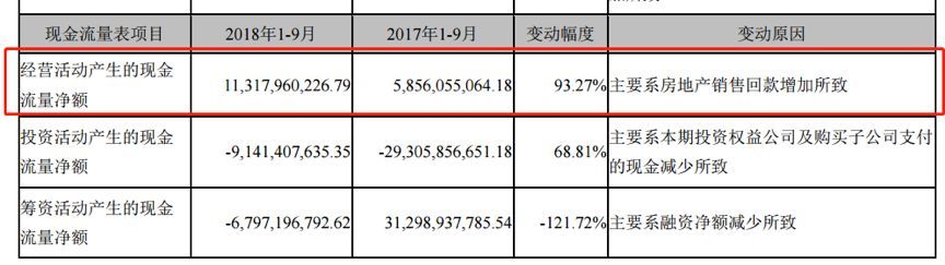 先重温一下三季报的数据。根据wind数据统计,申万行业分类标准下,房地产开发行业2018年三季报合计经营性净现金流为净流出。