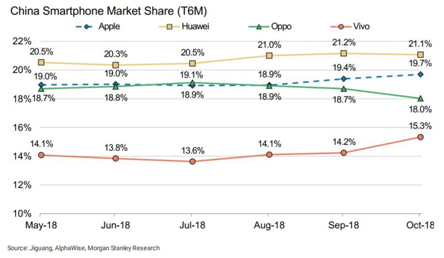 摩根史丹利的研报显示,受益于9月三款新机的上市,苹果手机在中国智能手机的市场份额有所提升,并超越OPPO,但仍低于华为。