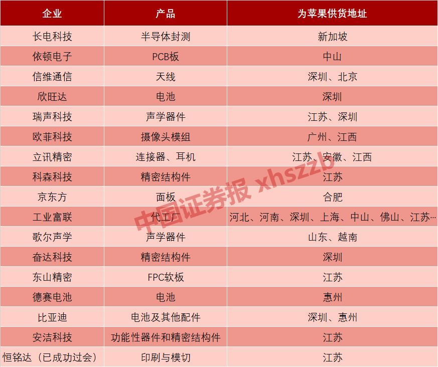 苹果今年4月更新了前200名供应商名单,中国证券报记者梳理发现,包括一家已经过会的,合计有18家A股公司为苹果前200强供应商,如工业富联、蓝思科技、欧菲科技、京东方、比亚迪等。