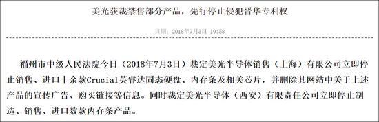 值得一提的是,作出裁定的福州中院曾于7月3日裁定美光半导体销售(上海)有限公司立即停止销售、进口十余款Crucial英睿达固态硬盘、内存条及相关芯片,并删除其网站中关于上述产品的宣传广告、购买链接等信息。