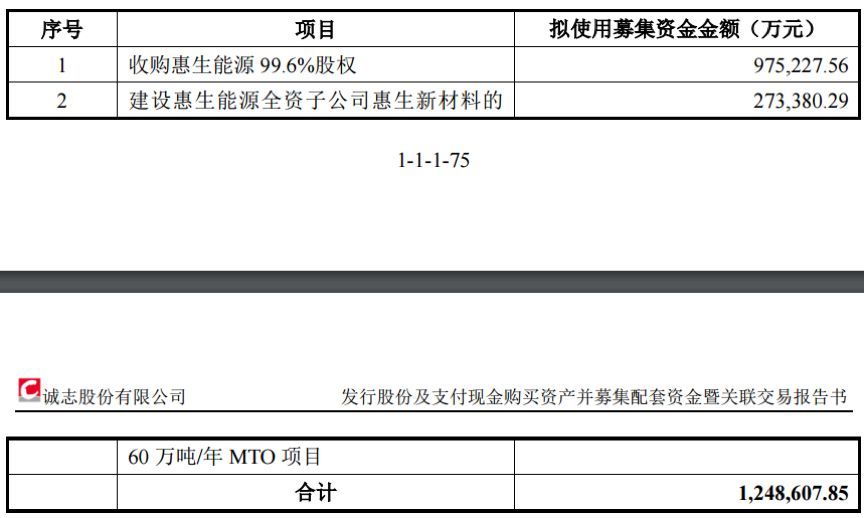 2016年,公司向诚志科融、华清创业等非公开发行募集资金总额不超过人民币124.86亿元用于收购收购南京惠生99.6%股权以及建设南京惠生全资子公司惠生新材料60万吨/年MTO项目: