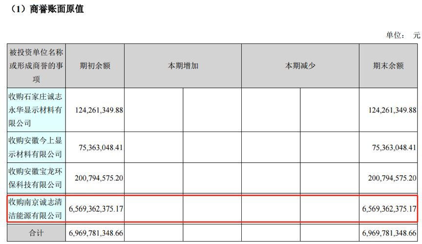 除南京诚志之外,并购产生商誉的还有宝龙环保、安徽今上及诚志永华三家公司,商誉账面原值分别约2.01亿元、7536.3万元及1.24亿元。