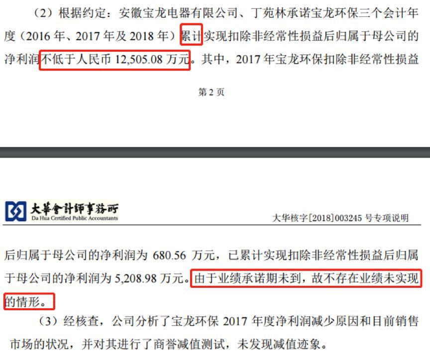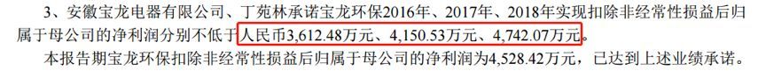 2016年年报显示,公司通过收购和增资的方式持有宝龙环保70%的股权,安徽宝龙电器有限公司、丁苑林承诺宝龙环保2016年、2017年、2018年实现扣除非经常性损益后归属于母公司的净利润分别不低于人民币3,612.48万元、4,150.53万元、4,742.07万元。