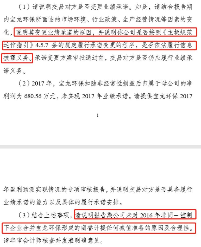 而2017年,宝龙环保扣非后归母净利润为680.56万元,并未实现2017年业绩承诺,也未就相关商誉计提减值。发现这一问题之后,交易所对合并宝龙环保形成的商誉未计提任何减值准备的原因及合理性提出问询: