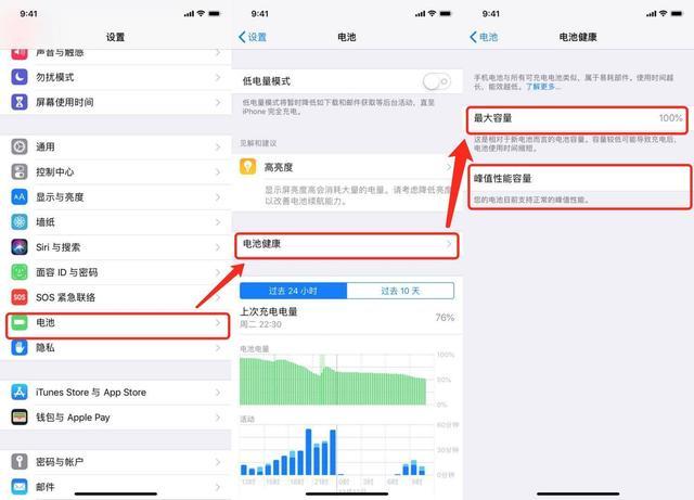 首先就是最简单易用的 iPhone 健康监测功能,从「电池门」事件之后,苹果就为 iPhone 增添了电池健康功能,用以查看电池最大容量和手机峰值性能。以 iPhone XR 为例,大家可以参考流程图查看进入方式。