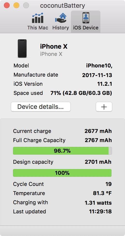 将 iPhone 和 Mac 连接并授权之后,打开 coconutBattery 就能开始检测了。