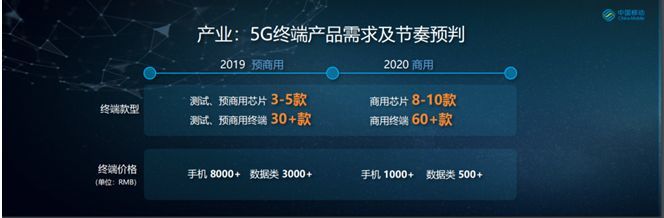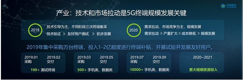 为此,中国移动在2019年将集中采购万台终端,投入1-2亿额度进行终端补贴,开展试验并发展友好用户。其中,2019年1月,中国移动将采购100+的测试终端;2019年3月,中国移动将采购500+的手机类、数据类终端;2019年7月,中国移动将采购10000+ 手机类、数据类终端。