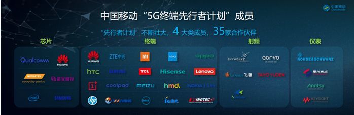 据了解,中国移动2018年2月推出的5G终端先行者计划,经过近一年的发展,规模不断壮大,已拥有芯片、终端、射频、仪表四大类成员,总计35家合作伙伴。其中,芯片成员涵盖了高通、英特尔在内的顶级芯片企业。