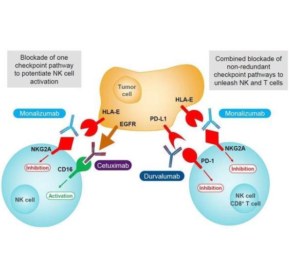 此次,Eric Vivier教授领导的研究团队发现,机体内的T细胞和NK细胞表面均含有NKG2A分子,其与其他细胞表面的配体结合后也可产生显著的“免死”机制。就像PD-L1受体阻断剂一样,我们是否可以利用这一机制研发新型的抗癌机制呢?Eric Vivier教授的研究团队开发出名为Monalizumab的单抗。这种单抗可以有效阻断NKG2A分子与其配体结合,进而启动T细胞和NK细胞对肿瘤细胞的查杀作用