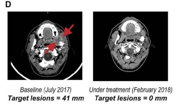 在进行完小鼠试验后,研究人员进行了人体实验,首先他们筛选了31名鳞状细胞头颈癌患者,对其进行了分组,分别使用了不同剂量的NKG2A单抗以及EGFR受体抑制剂cetuximab。最终这31名患者中,8名患者有超过30%的肿瘤减少,14名患者病灶减少50%,病情得到有效缓解,甚至一名患者病灶完全消失了!