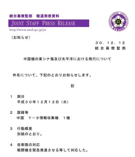 日本防卫省统合幕僚监部12日发布的资料显示,当天,一架飞机从东海方向飞来,经识别后判明为中国的“运-9情报收集机”,随后紧急派遣航空自卫队的战斗机进行应对。