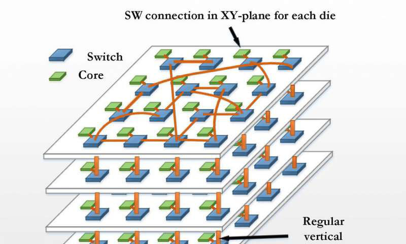 这个图显示了一个3D多核芯片,其中处理核心通过垂直链接连接