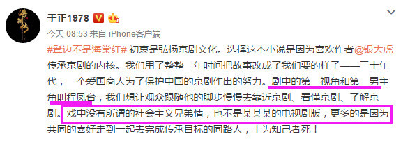虽然于正的这部新戏因为选角的原因遭到了网友的嘲笑,但是不得不承认于正在传承文化方面一直都做的不错。继《延禧攻略》里的绒花、缂丝等工艺之后,于正在《鬓边》里主要是弘扬了京剧文化。于正强调了故事情节没有所谓的社会主义兄弟情,也不是某某某的电视剧版。虽然对于于正的话大家都选择无视,但是该剧的摄影棚配置真的是要给个好评的。