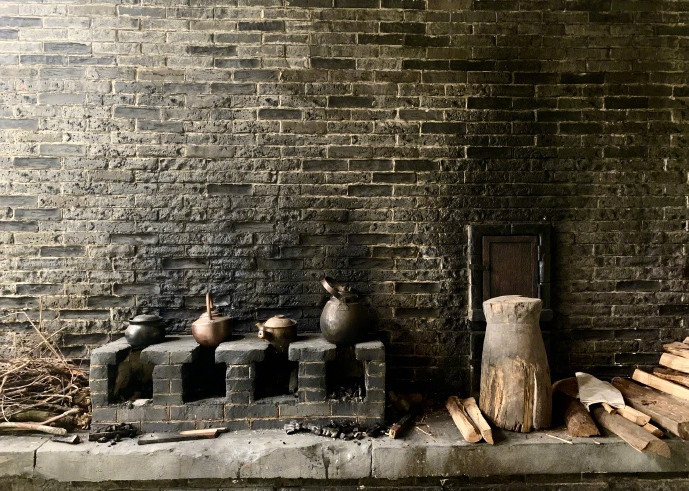 还有墙边烧水的简易灶台,上面摆的四个大小各异的水壶也是很有年代感了,尤其是在墙面上的长年累月烟熏火燎的烟火气真的是很逼真啊!