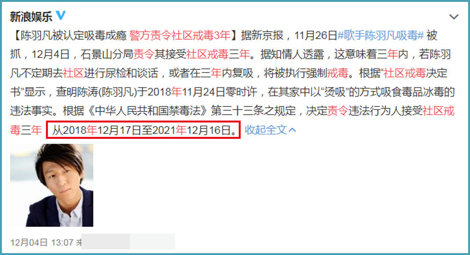 并且随后判罚出来后,陈羽凡需要在2018年12月17日至2021年12月16日进行社区戒Du三年,也就是说,陈羽凡如果真的要在公开场合现身,至少要看12月17日。