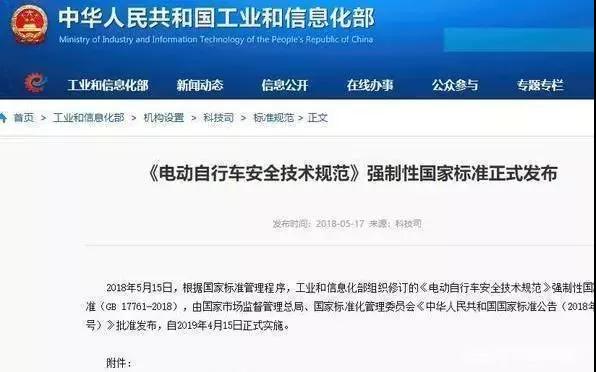 新国标是今年5月份由国家市场监督管理总局、国家标准化管理委员会及工信部等四部门批准发布的《电动自行车安全技术规范》国家标准。新修订的《规范》废除了长达19年的旧规,调整完善了电动自行车最高车速、整车质量、脚踏骑行能力等技术要求,意在保证大众出行安全。