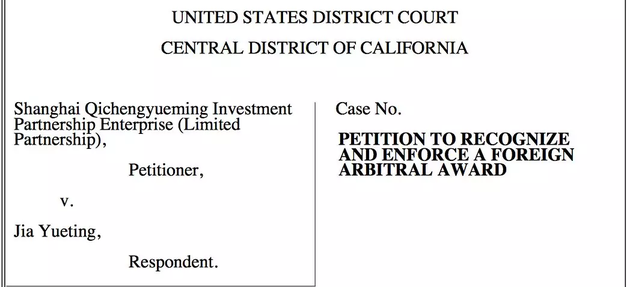 此外,今年9月5日,上海奇成悦名投资合伙企业(有限合伙)(以下简称“奇成悦名”)也向美国加州中区法院申请仲裁。