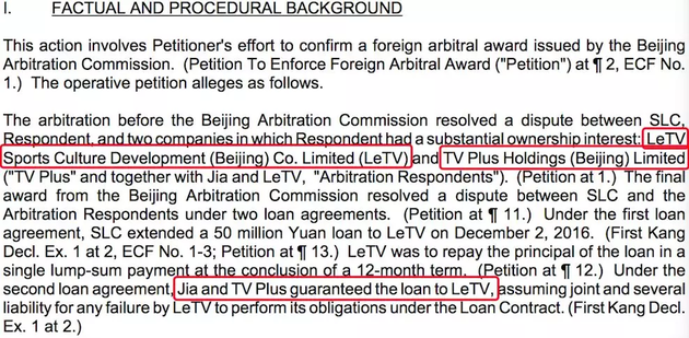 今年1月22日,北京仲裁委员会裁定,乐视体育、贾跃亭和乐视控股应偿还:(1)5000万元人民币贷款;(2)偿还2017年3月15日以来的利息,年利率为7.5%。