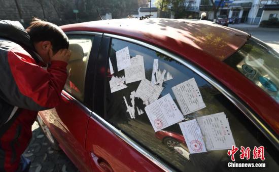 资料图:一私家车上贴满罚单。 中新社记者 泱波 摄
