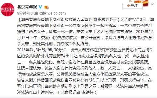 2018年7月3日,湖南省娄底市长青地下商业街一公共厕所旁发生一起凶杀案,一名中年男子持刀捅伤了两名女子,造成一死一伤。据娄底市中级人民法院官方通报,2018年12月17日下午,娄底中院依法对该案一审公开宣判,法院以被告人谢方伟犯故意杀人罪,判处其死刑,剥夺政治权利终身。