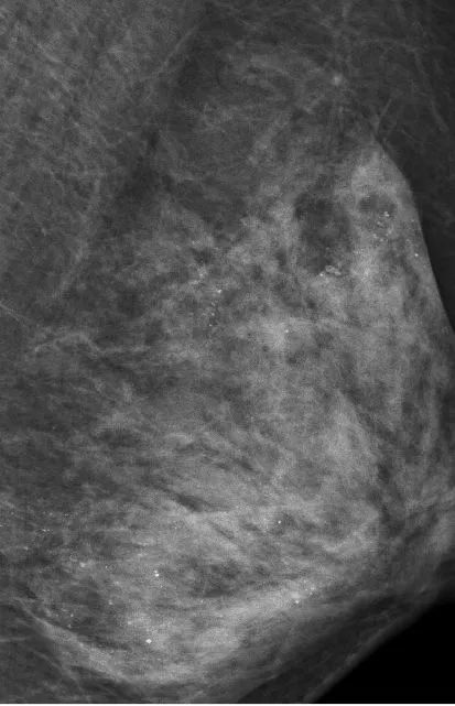 最让医生意外的是她的左侧乳房。乳腺X线检查时,发现里面全部都是细小如沙子一样的钙化灶,布满整个乳腺。