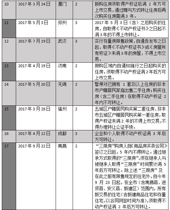 其中,保定、佛山的限售年限长达十年,海口、石家庄的限售年限为5年,厦门、杭州、福州等则普遍在2~3年。