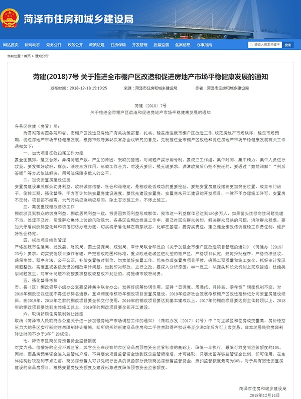 12月18日,山东省菏泽市住房和城乡建设局发布《关于推进全市棚户区改造和促进房地产市场平稳健康发展的通知》(菏建〔2018〕7号),通知第六条明确规定:取消新购住房限制转让措施。