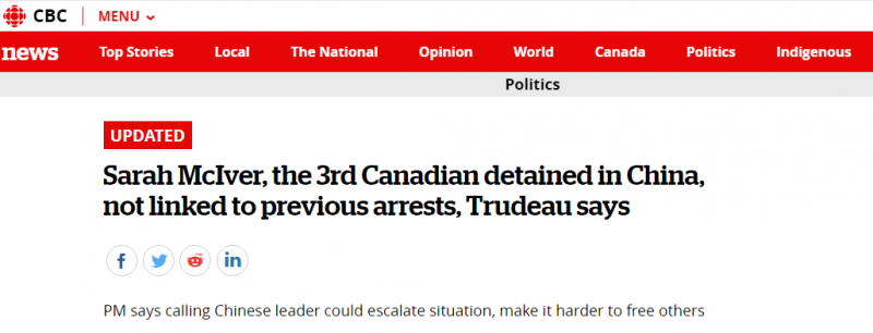 原标题:第三名在华被拘捕的加拿大公民或为女性 加总理 与此前被拘事件无关