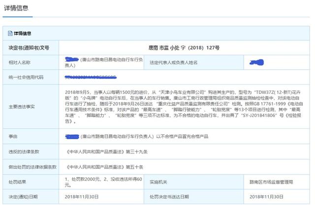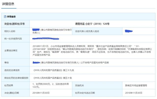 日前,据相关部门行政执法事后公开信息显示,唐山路南区两家电动车行因以不合格产品冒充合格产品被查处,路南区市场监督管理局依法对上述两家电动车行分别处罚款2000元、没收违法所得的处罚,详细内容如下: