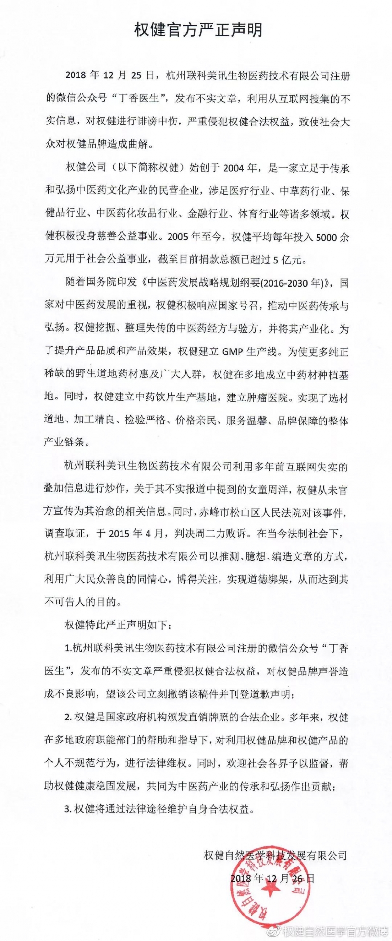 (权健官方声明)