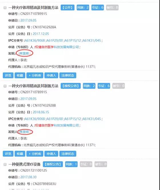 在国家知识产权局网站上,关于权健公司的专利登记只有37条,与对外传承的数据出入较大。在这37条登记信息中,的确有权健创始人束昱辉的各项专利发明技术。